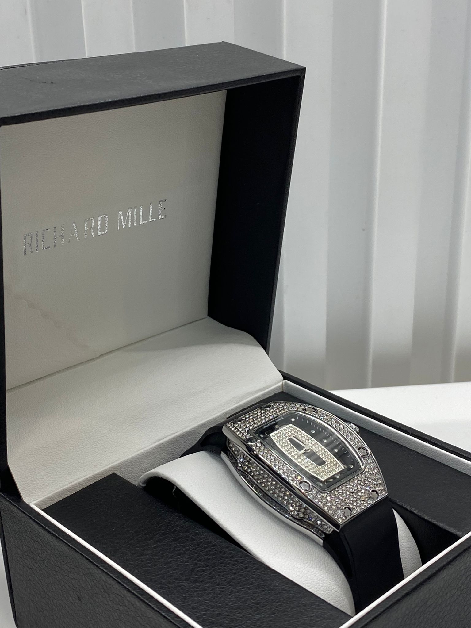 ساعة فاخرة بتصميم جريء ولافت، تجمع بين الأناقة والترف بأسلوب عصري. الإطار مرصّع بالكامل بحبيبات لامعة تعكس الضوء بشكل راقٍ، مع تفاصيل معدنية دقيقة تعطيها طابعًا فخمًا. المينا بتصميم مميز وغير تقليدي، يبرز الذوق العصري ويضيف لمسة أنثوية جذابة.