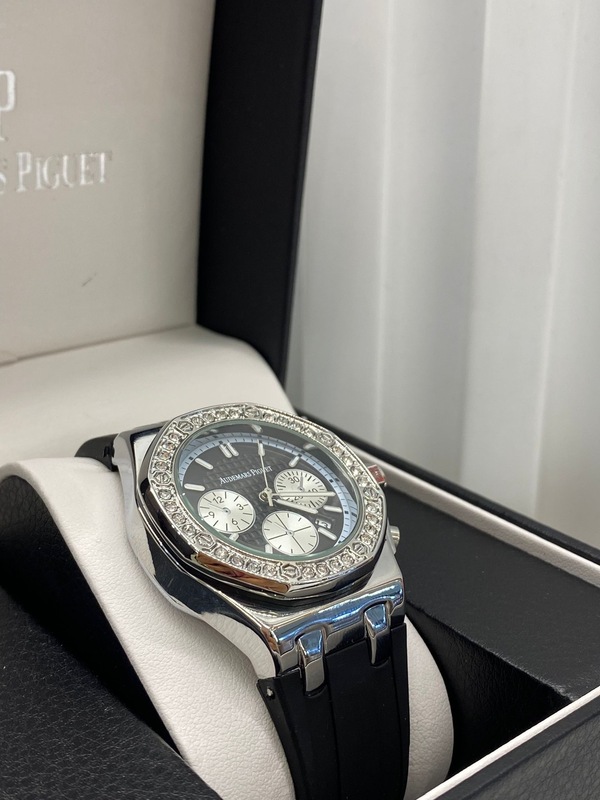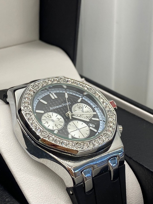ساعة فاخرة بتصميم راقٍ يعكس الذوق الرفيع، بعلبة معدنية لامعة وإطار مرصّع بحجارة براقة تضيف لمسة من الفخامة اللافتة. الميناء أنيق بتفاصيل دقيقة مع عدّادات كرونوغراف تعطيها طابعاً عملياً وعصرياً بنفس الوقت. السوار مريح بتصميم عصري يكمل أناقة الساعة ويجعلها مناسبة للإطلالات اليومية والرسميّة. تأتي داخل علبة أنيقة تضيف قيمة إضافية للتجربة وتبرز فخامتها