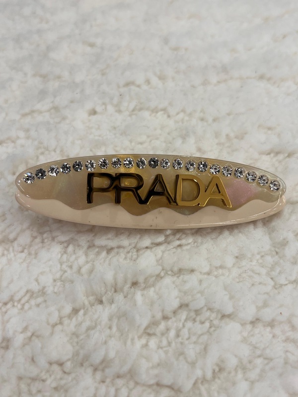 مشبك شعر مصمم بتصميم عصري انيق من برادا باللون البيج على بالوسط اسم العلامة التجارية برادا معدني باللون الذهبي