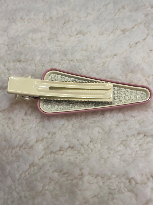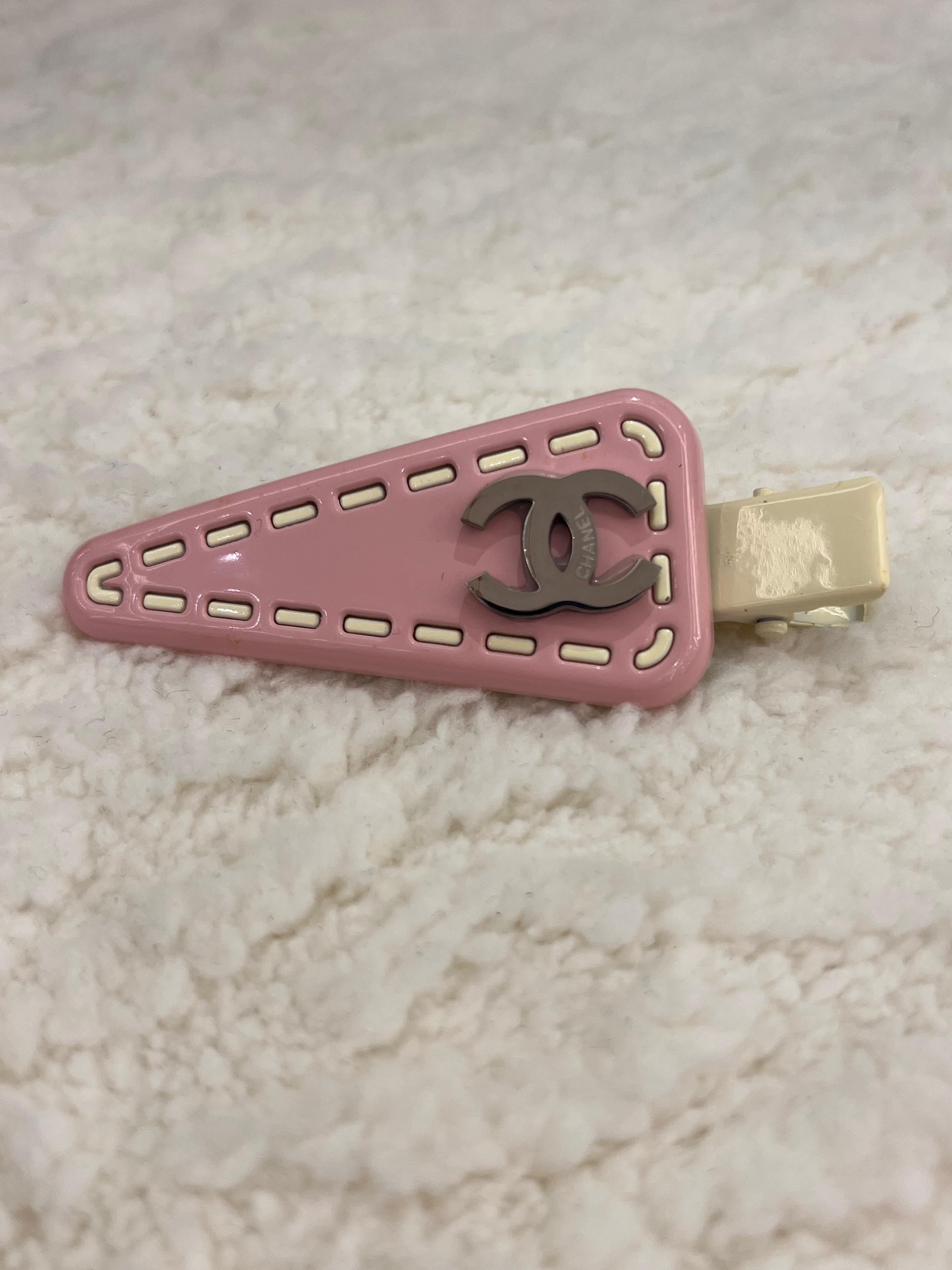 مشبك شعر مصمم بتصميم عصري انيق على شكل مثلث جانبي من شانيل باللون الزهري مع شعار العلامة التجارية شانيل باللون السكني