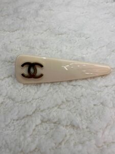 مشبك شعر مصمم بتصميم عصري انيق على ة من شانيل باللون الفضي مع شعار العلامة التجارية شانيل باحجار الستراس واسم العلامة التجارية باللون الاسود