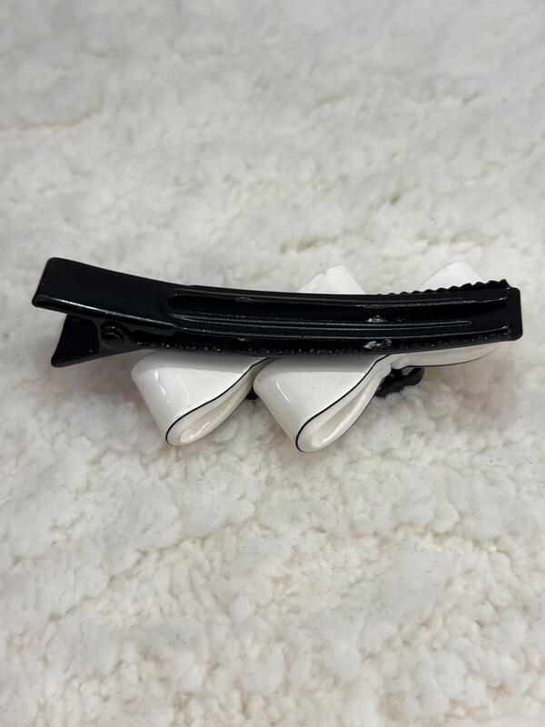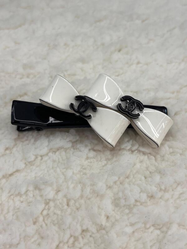 مشبك شعر مصمم بتصميم عصري انيق على شكل ببيونة من شانيل باللون الاسود والابيض مع شعار العلامة التجارية