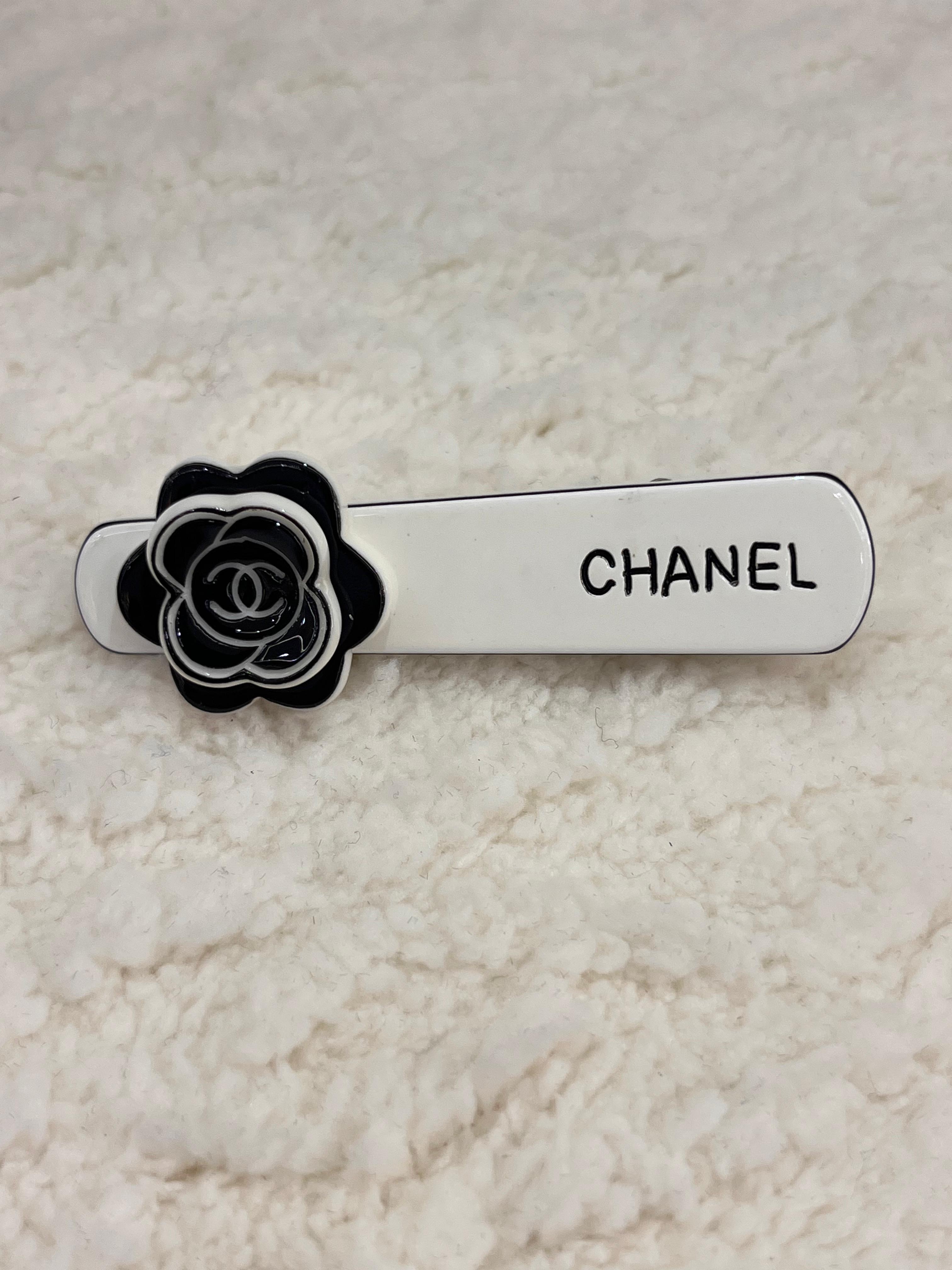 مشبك شعر مصمم بتصميم عصري انيق من شانيل باللون الاسود والابيض مع شعار العلامة التجارية على شكل وردة