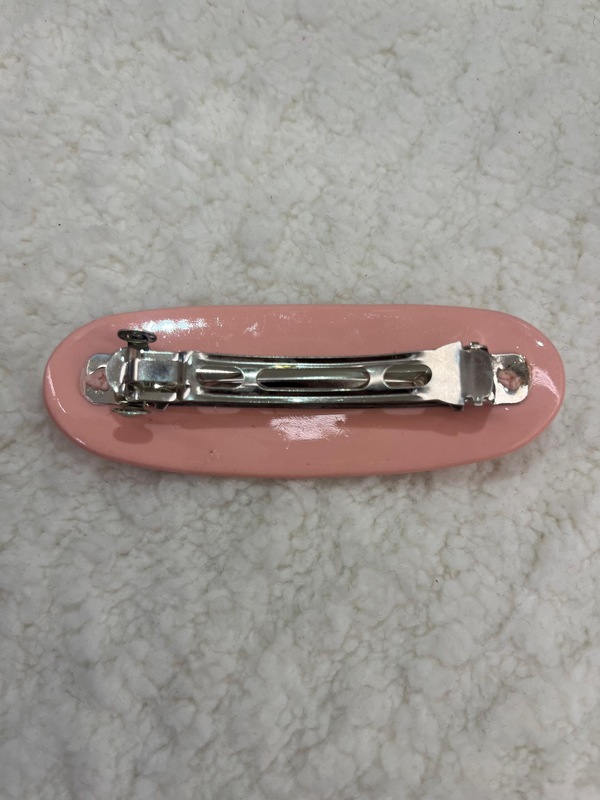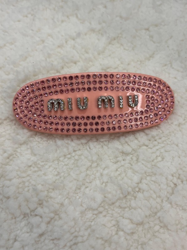 مشبك شعر مصمم بتصميم عصري انيق من miu miu باللون الزهري مع اسم العلامة التجارية باللون الفضي وستراس