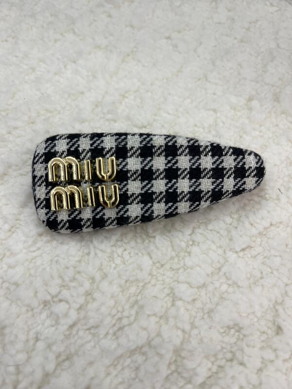 مشبك شعر مصمم بتصميم عصري انيق من miu miu باللون الاسود والابيض كاروهات مع اسم العلامة التجارية باللون الذهبي