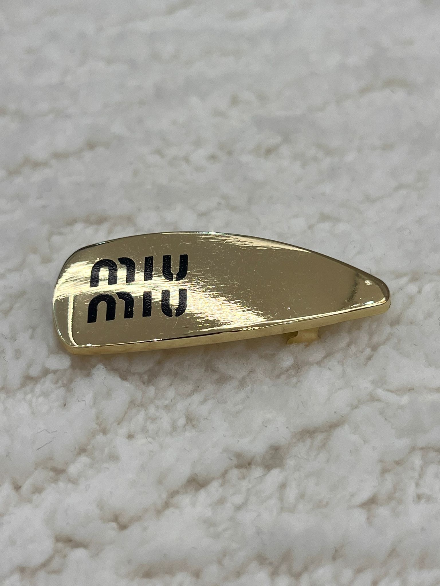 مشبك شعر ميو ميو بتصميم عصري انيق على شكل مثلث باللون الذهبي مع اسم العلامة التجارية باللون الاسود