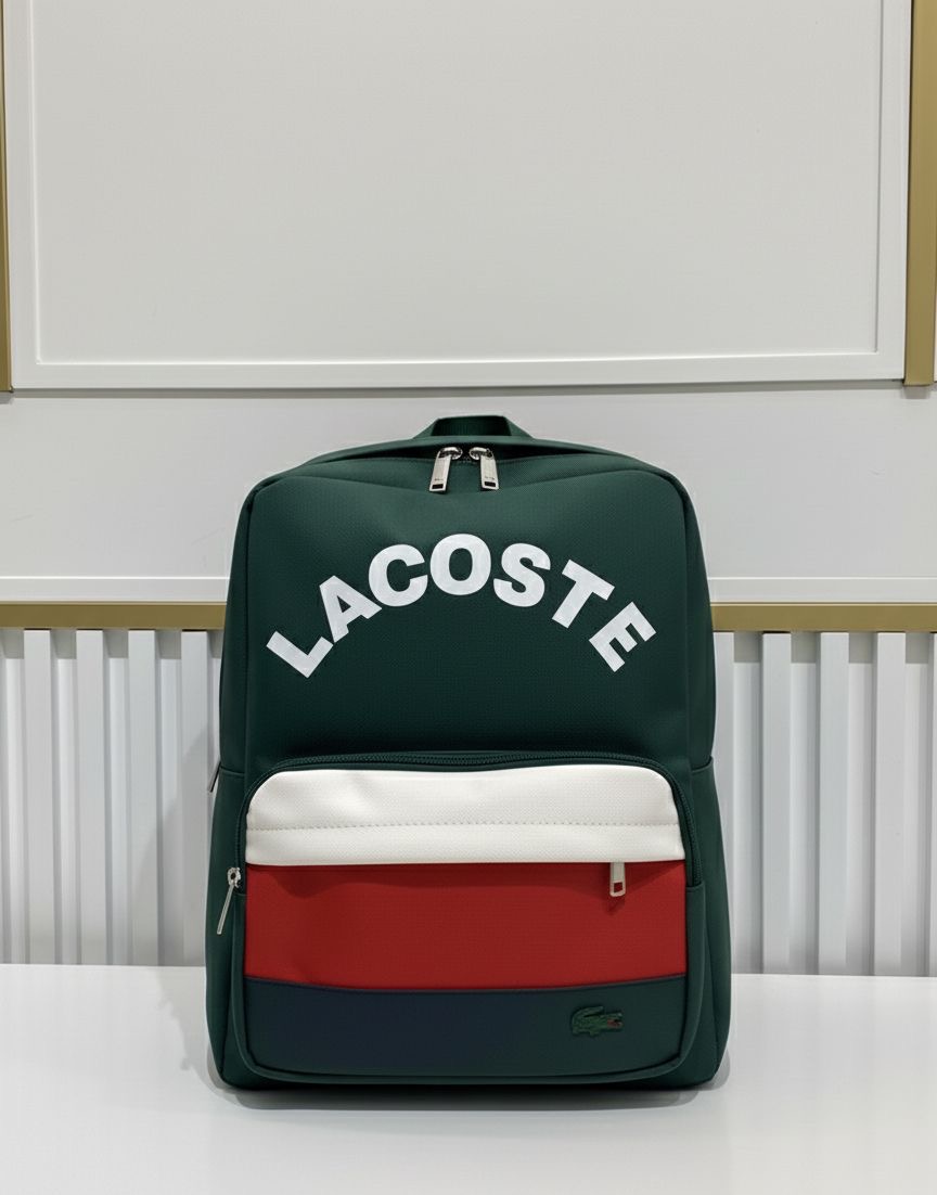 حقيبة ظهر أنيقة من Lacoste بتصميم عصري يجمع بين البساطة واللمسة الرياضية الراقية. مع اسم العلامة التجارية في الأعلى لإبراز هوية العلامة.