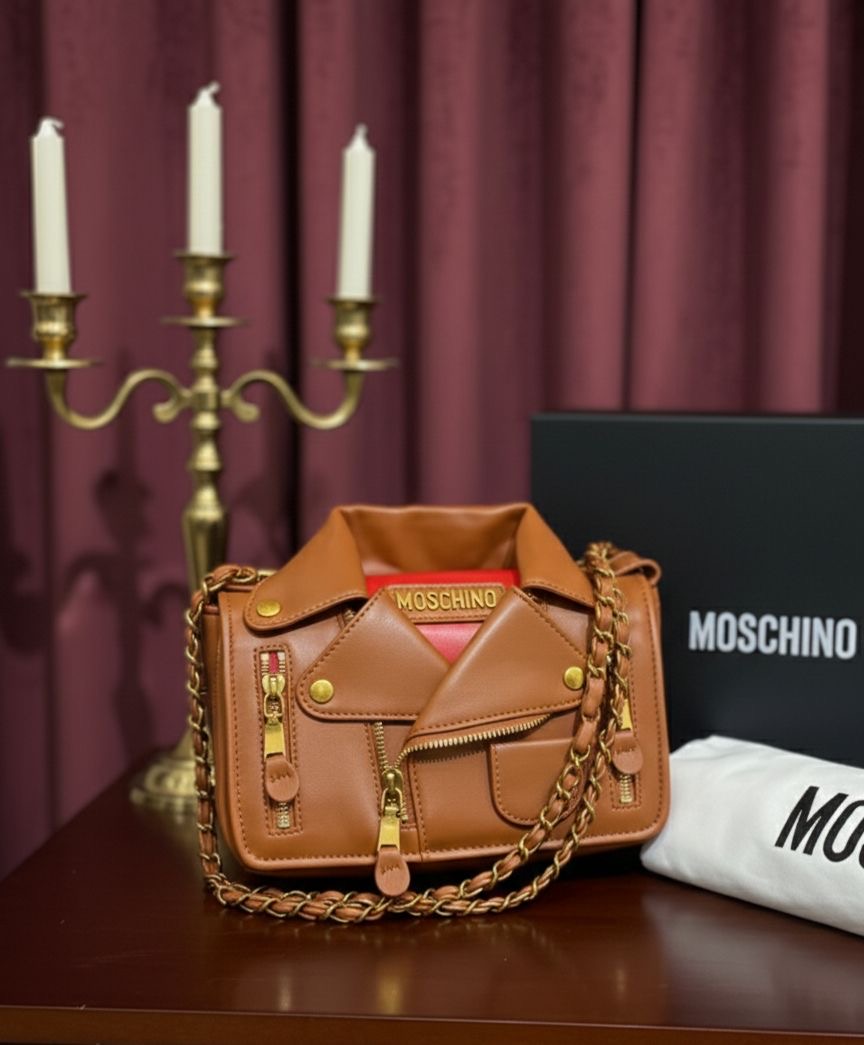 شنطة MOSCHINO بتصميم مميز مستوحى من جاكيت الجلد، تعكس جرأة وأناقة بنفس الوقت. مصنوعة بجودة عالية مع تفاصيل معدنية لامعة بتضيف لمسة فخامة واضحة. تصميمها العملي بحجم مناسب للاستخدام اليومي أو الطلعات، وبتلفت النظر بذوقها المختلف والعصري.