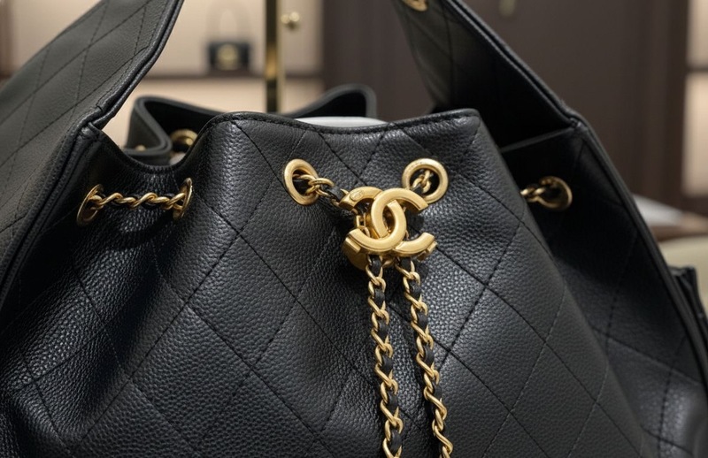 حقيبة شانيل الفاخرة بتصميم Bucket أنيق تجمع بين الرقي والعملية في آنٍ واحد. مصنوعة من جلد أسود عالي الجودة بنقشة مبطّنة كلاسيكية تعكس هوية شانيل العريقة. تأتي الحقيبة بسلسلة معدنية ذهبية تضيف لمسة فخامة، مع إغلاق بحبل وسلسلة أمامية مزينة بشعار شانيل الأيقوني.