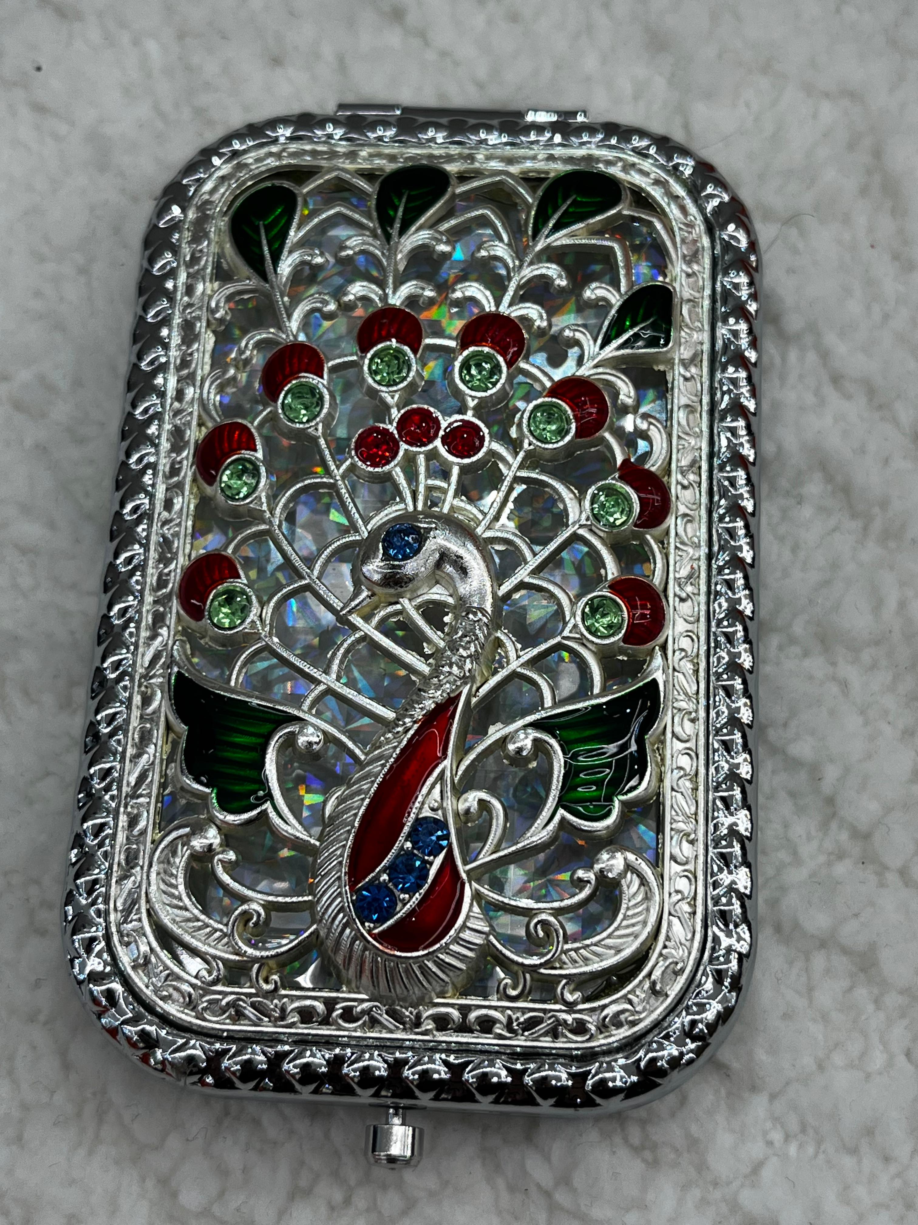 مرآة جيب مستطيلة بتصميم كلاسيكي أنيق مستوحى من الطابع vintage، مزينة بنقشة طاؤوس فضي فنية مع أحجار لامعة تضيف لمسة فخامة يمنحها مظهراً راقياً يناسب الذوق الكلاسيكي والعصري في آنٍ واحد