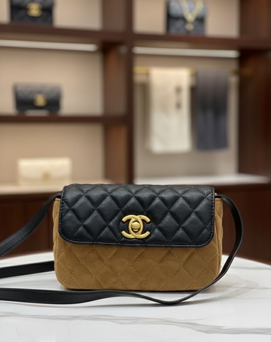 شنط شانيل كتف أنيقة بتصميم فاخر يجمع بين البساطة والرقي. تأتي بواجهة مبطنة مع غطاء علوي بلون داكن يضفي لمسة عصرية مميزة. مزودة بشعار شانيل متداخل باللون الذهبي في المنتصف، يمنح الحقيبة طابعًا راقيًا وجذابًا.