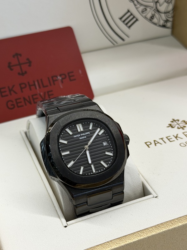 الهيكل (Case): تصميم "نوتيلوس" الثماني الأيقوني، بطلاء أسود فاخر مقاوم للخدش.