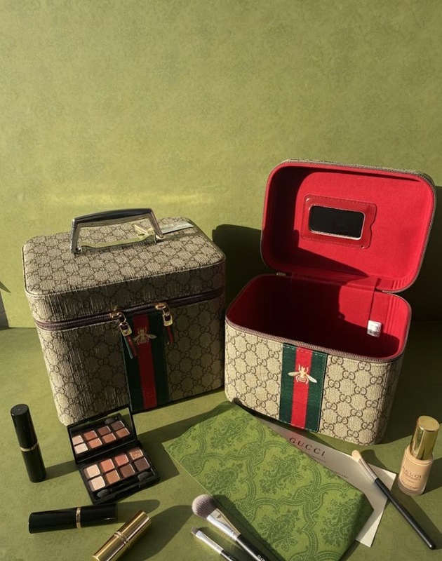 Gucci الكلاسيكي. تتميز بنقشة المونوغرام المعروفة مع الشريط الأخضر والأحمر في المنتصف وتفصيلة النحلة الذهبية التي تضيف لمسة فخامة مميزة. تأتي بشكل صندوق عملي مع يد علوية لسهولة الحمل وسحاب محكم يحافظ على مستحضرات التجميل مرتبة وآمنة. حجمها مناسب لتخزين المكياج اليومي مثل أحمر الشفاه، كريم الأساس، الفرش وباليت الظلال، مما يجعلها مثالية للاستخدام اليومي أو أثناء السفر. ✨