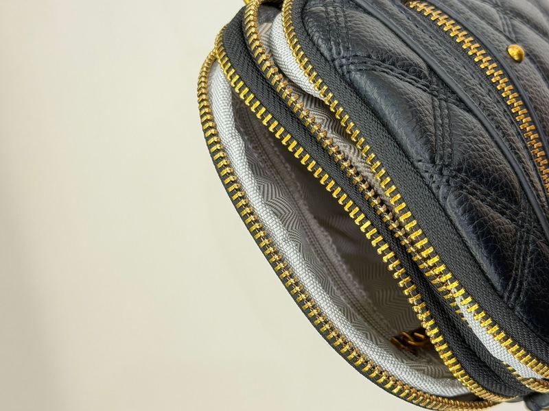 شنط كروس مبطنة من الجلد، بسحاب علوي، وأجزاء معدنية ذهبية اللون، وميدالية جلدية صغيرة قابلة للفصل معلقة من سحاب الإغلاق، إلى جانب حزام جلدي حجم القاعدة 15سم