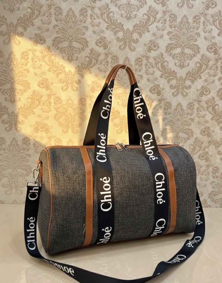 المقابض حزام من القماش بتصميم يبدا من قاعدة الشنطة الى الاعلى مع اسم العلامة التجارية