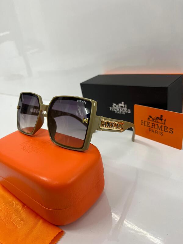 نظارة هيرمز فاخرة بإطار عريض ولمسات راقية على الجوانب، عدسات سوداء تمنحك دفء وأناقة، وتصميم كلاسيكي–مودرن يرفع اللوك بأيّ إطلالة بثقة ولمسة فخامة هادئة