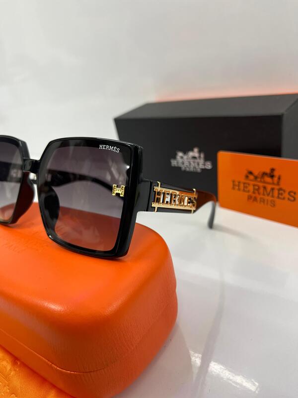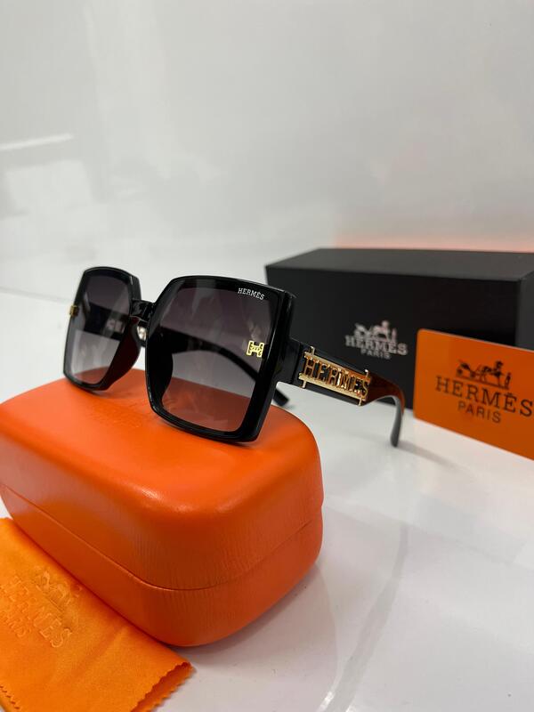 نظارة هيرمز فاخرة بإطار عريض ولمسات راقية على الجوانب، عدسات سوداء تمنحك دفء وأناقة، وتصميم كلاسيكي–مودرن يرفع اللوك بأيّ إطلالة بثقة ولمسة فخامة هادئة