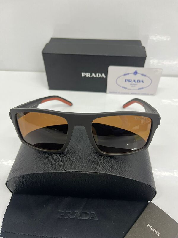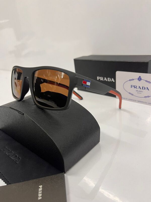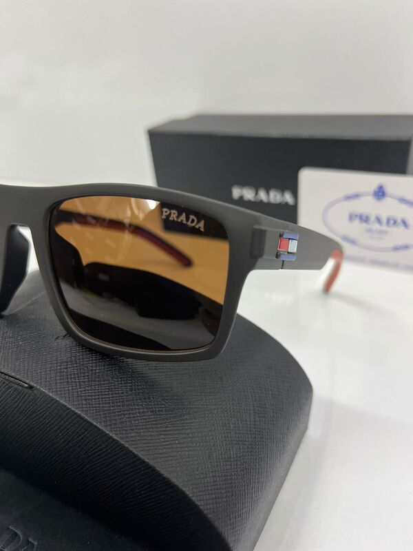 نظارة برادا فاخرة بإطار عريض ولمسات راقية على الجوانب، عدسات عسلية تمنحك دفء وأناقة، وتصميم كلاسيكي–مودرن يرفع اللوك بأيّ إطلالة بثقة ولمسة فخامة هادئة