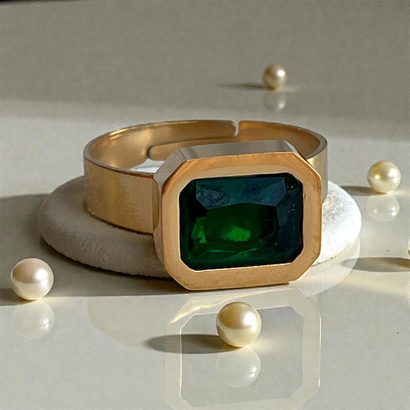 خاتم ذهبي مصنوع بشكل حلقة من الامام على شكل مربع ذهبي يتوسطه مربع باللون الاخضر اللامع