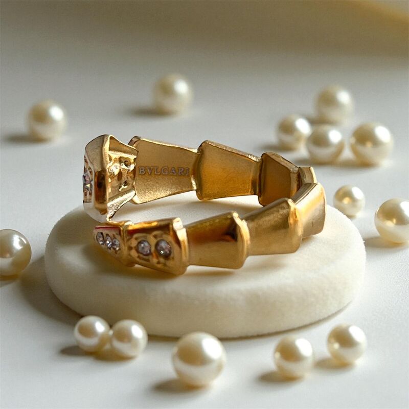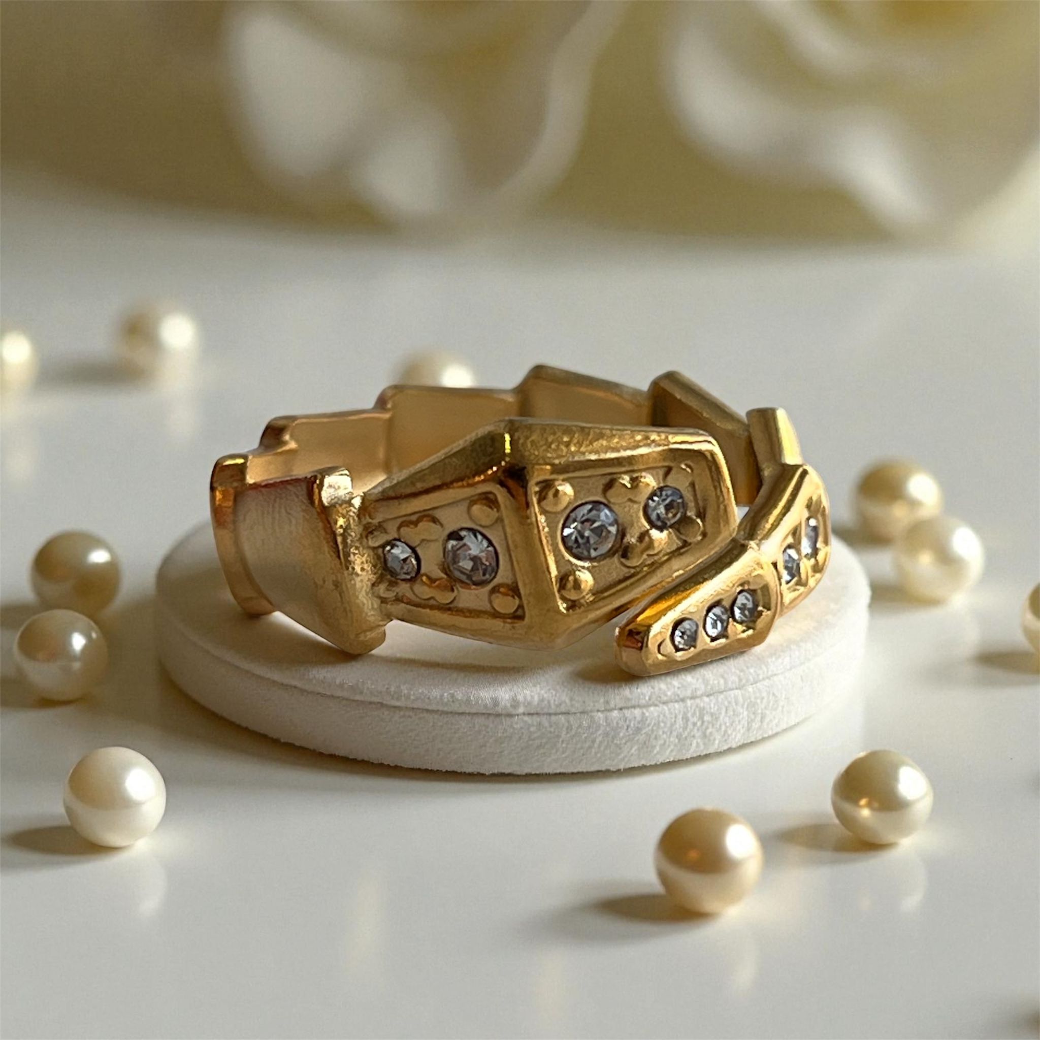 خاتم مصصم بشكل افعى ملتفه باللون الذهبي راس الخاتم وذيله محفور بدوائر صغيرة ستراس فضية