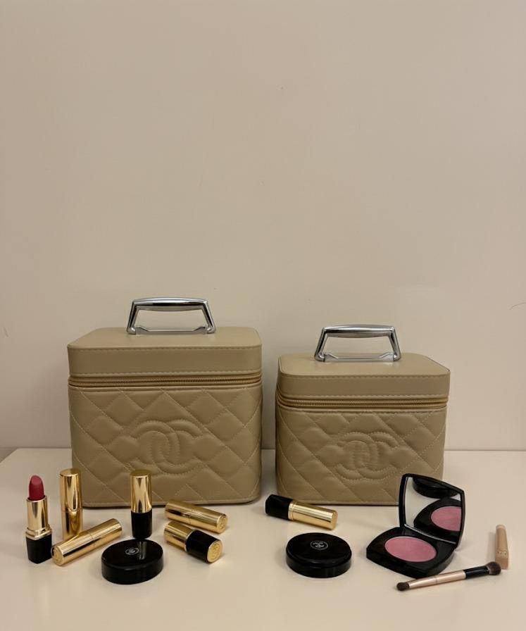 يتكون من صندوقان مكياج فخمَين بالوان مختلفة. ، أحدهما أكبر من الآخر، كلاهما بتصميم مُحاك بنقشة راقية وسحاب ذهبي فاتح، مع مقبض معدني لامع في الأعلى يمنحهما مظهرًا فاخرًا وعصريًا.