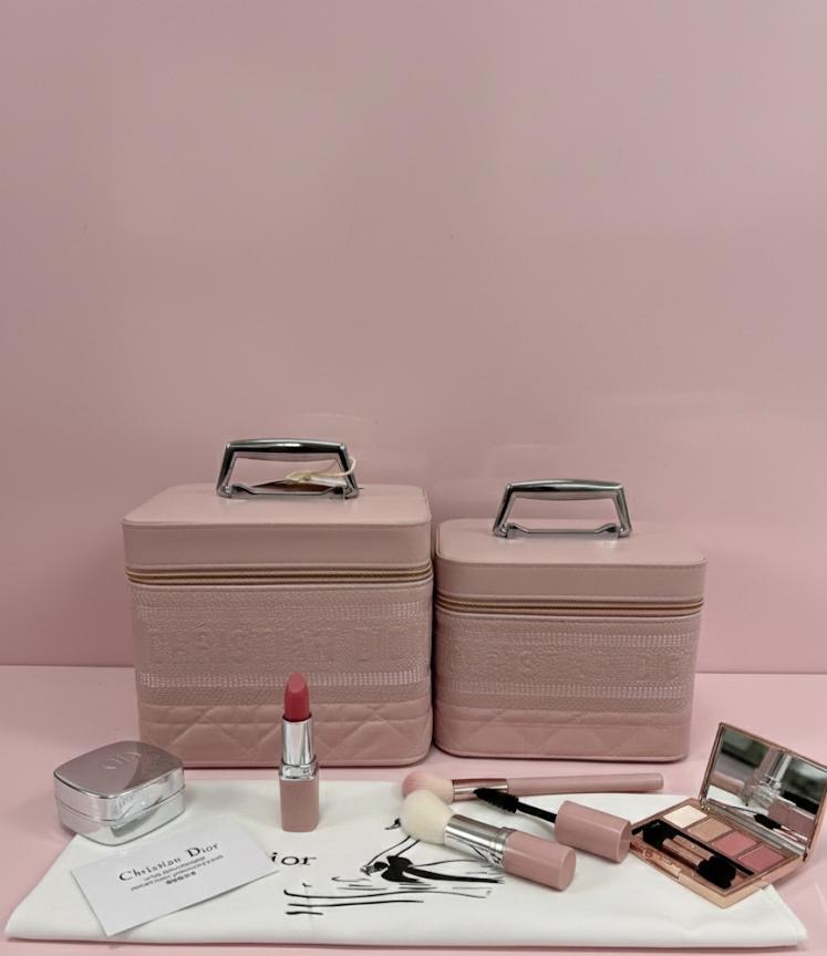 يتكون من صندوقان مكياج فخمَين بالوان مختلفة. ، أحدهما أكبر من الآخر، كلاهما بتصميم مُحاك بنقشة راقية وسحاب ذهبي فاتح، مع مقبض معدني لامع في الأعلى يمنحهما مظهرًا فاخرًا وعصريًا.
