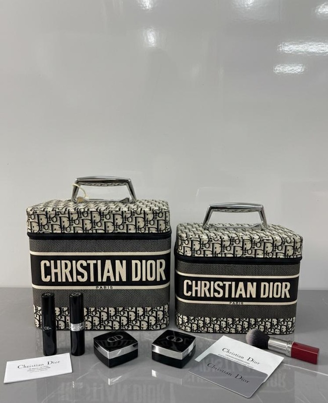 يتكون من صندوقان مكياج فخمَين بالوان مختلفة. ، أحدهما أكبر من الآخر، كلاهما بتصميم مُحاك بنقشة راقية وسحاب ذهبي فاتح، مع مقبض معدني لامع في الأعلى يمنحهما مظهرًا فاخرًا وعصريًا.