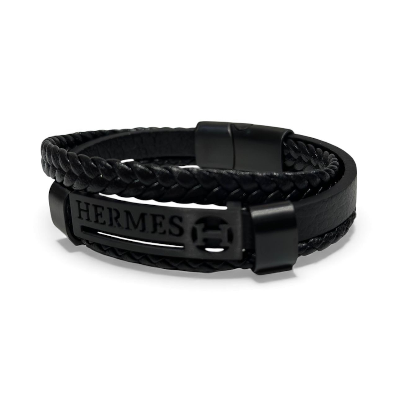 مصنوعة من جلد متين على شكل حبل ملتف بالوسط معدن اسود اللون محفور داخله اسم العلامة التجارية HERMES