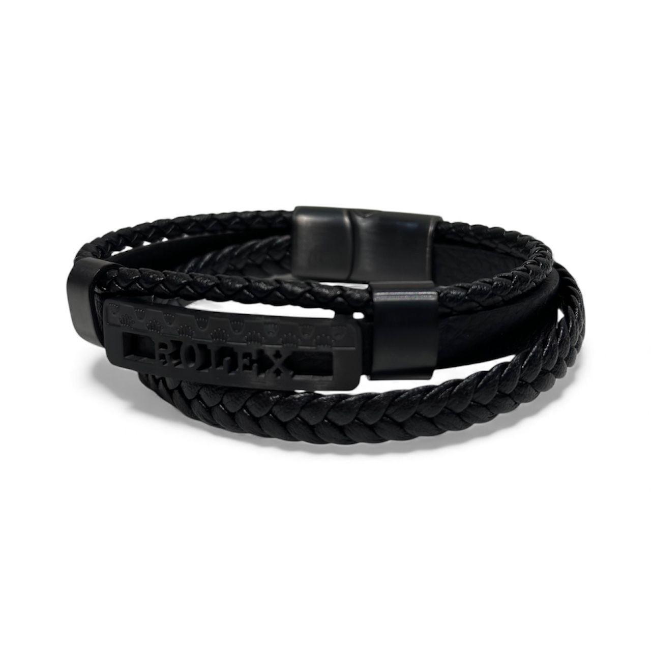 مصنوعة من جلد متين على شكل حبل ملتف بالوسط معدن اسود اللون محفور داخله اسم العلامة التجارية ROLEX