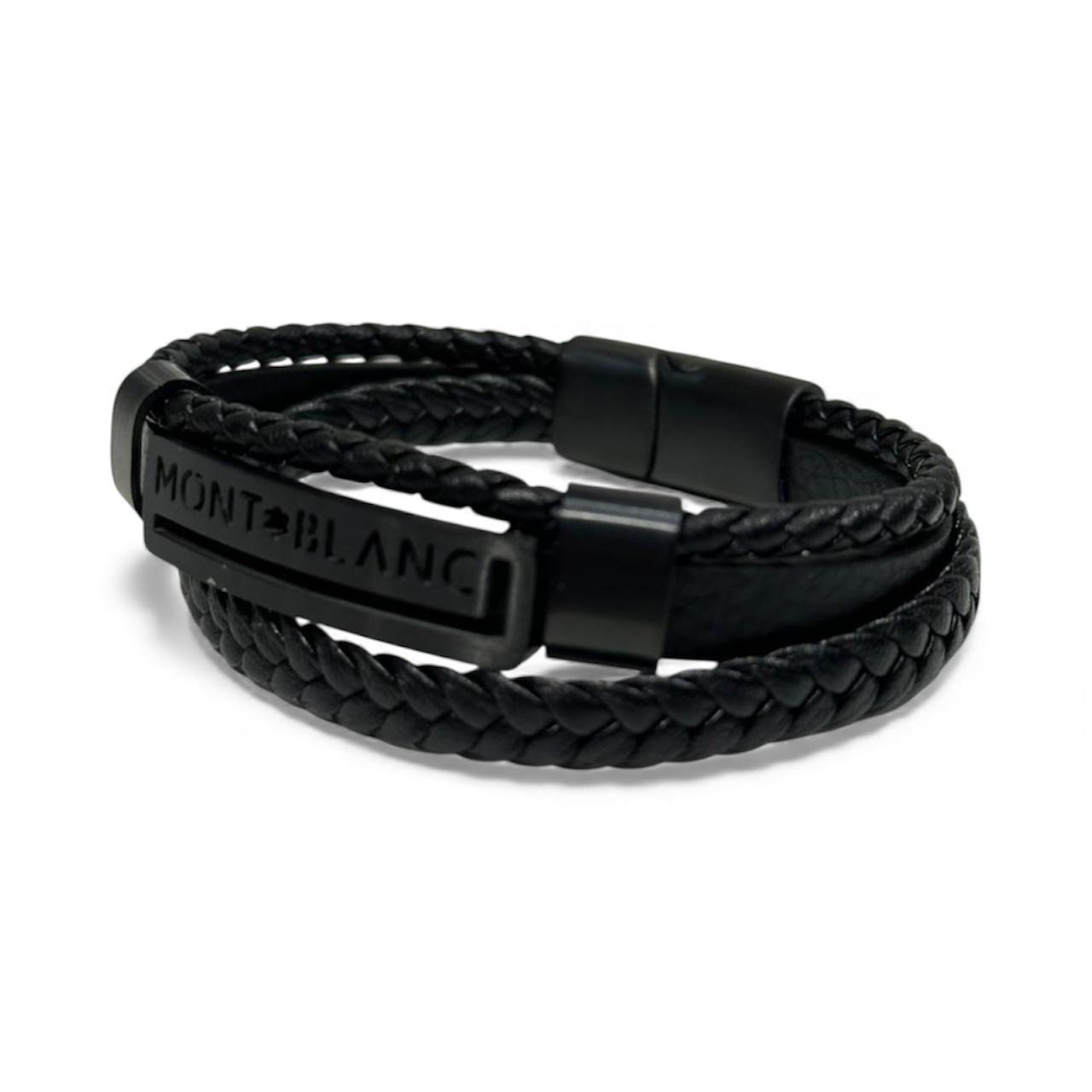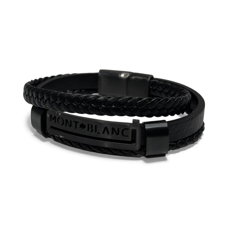 مصنوعة من جلد متين على شكل حبل ملتف يتوسطه مستطيل اسود محفور داخله اسم العلامة التجارية MONT BLANK