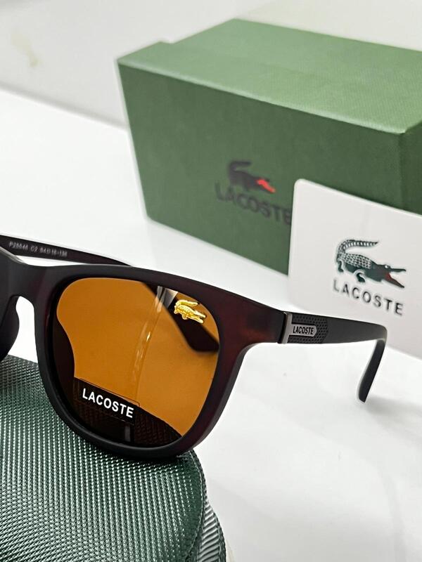 “نظارة شمسية من Lacoste بتصميم بني أنيق وعدسات داكنة، مع لمسة ذهبية وشعار التمساح. مرفقة بعلبة أصلية وقطعة تنظيف.