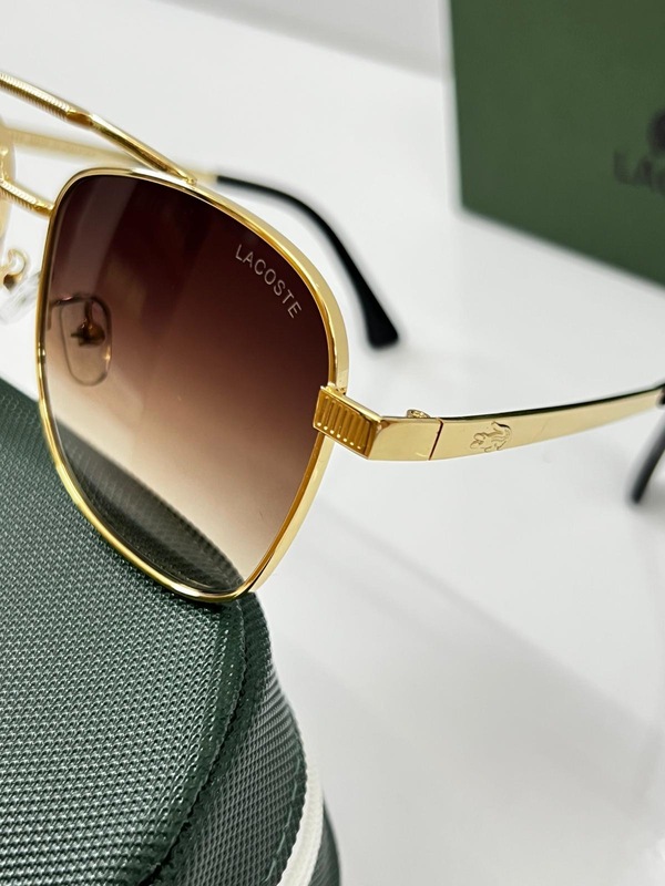 “نظارة شمسية من Lacoste بتصميم بني أنيق وعدسات داكنة، مع لمسة ذهبية وشعار التمساح. مرفقة بعلبة أصلية وقطعة تنظيف.
