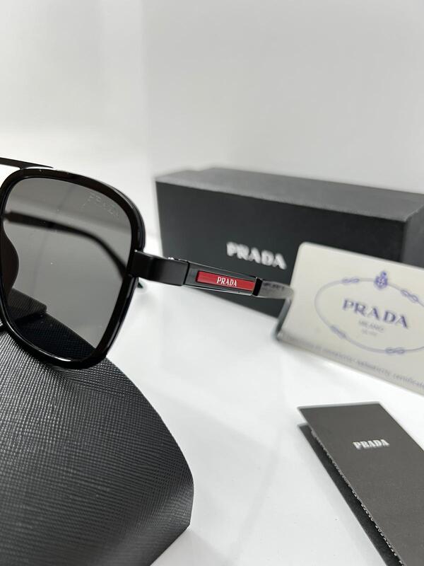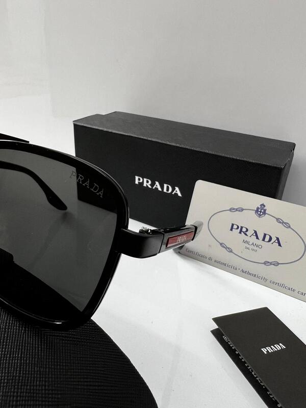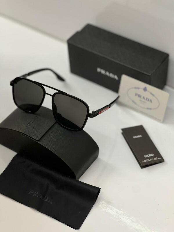 نظارة شمسية Prada بتصميم مستطيل عصري، عدسات سوداء رؤية مريحة، وإطار خفيف مع لمسات ذهبية على الذراع تحمل شعار أرماني المميز. خيار أنيق ومناسب للاستخدام اليومي
